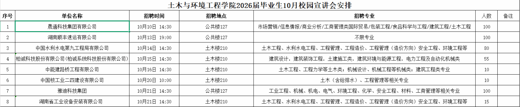 土木与环境工程学院2026届毕业生10月校园宣讲会安排