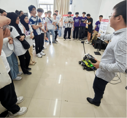 实验室接待工作分四批有序进行。在实验室主任徐卓君老师和研究生郑世元的详细讲解与操作演示下,马来亚师生近距离观摩了多项高端智能设备,包括桥梁健康检测机器人、大坝压实级配无人机测量系统、3D-DIC全场应变与温度测量系统、管道检测机器人等。这些设备融合人工智能、机器视觉、物联网等前沿技术,体现了土木工程智能化、数字化的发展方向。